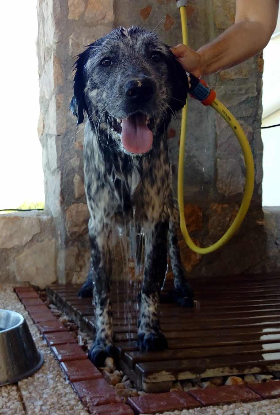 Benny erfreut sich regelmäßiger Duschen, die nicht nur wohltuende Erfrischung bringen, sondern nach den Toberunden mit Hundekumpel Paul über Stock und Stein und quer durch jedes Beet auch zwingend notwendig sind: