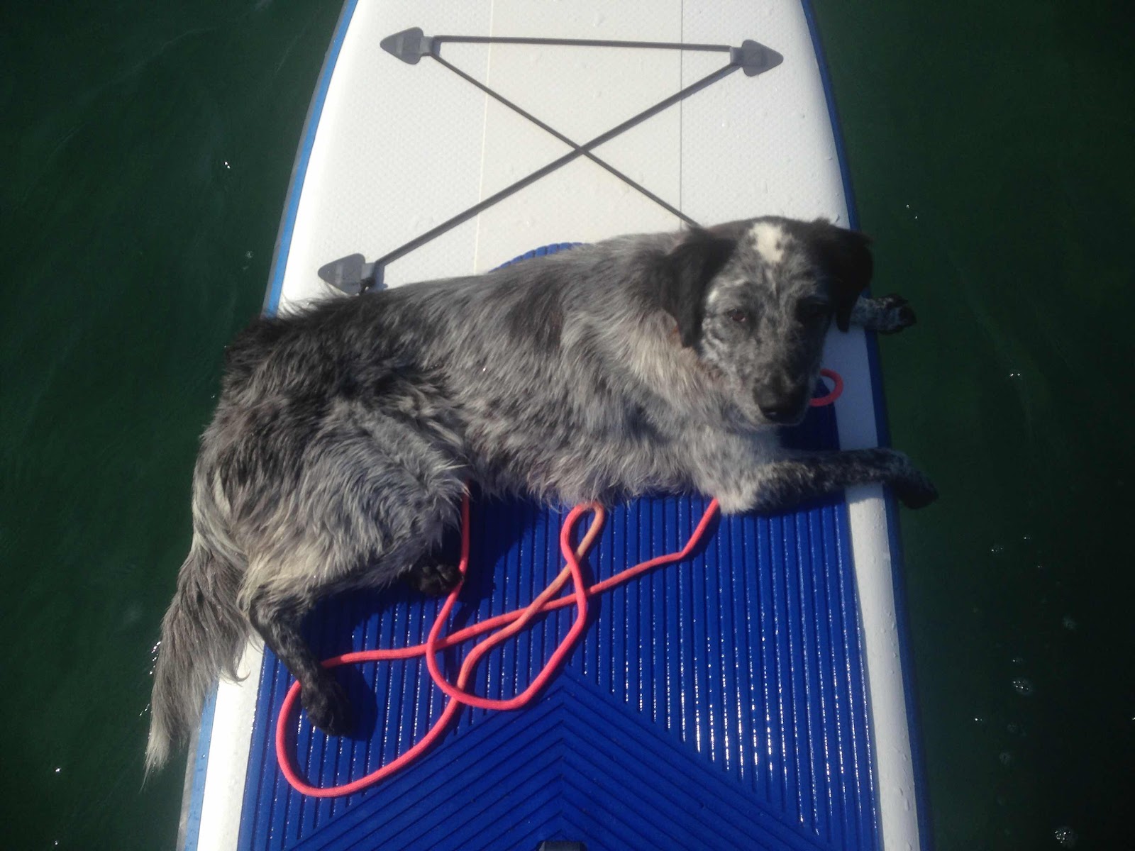 Morgens ist das Meer immer ruhig und glatt, genau die richtigen Bedingungen für das SUP und zum paddeln. Benny macht seine Sache immer besser, inzwischen kann Frauchen auch schon mit ihm an Bord stehen, brav bleibt er liegen und hängt gelegentlich gelassen ein Pfötchen ins Wasser.