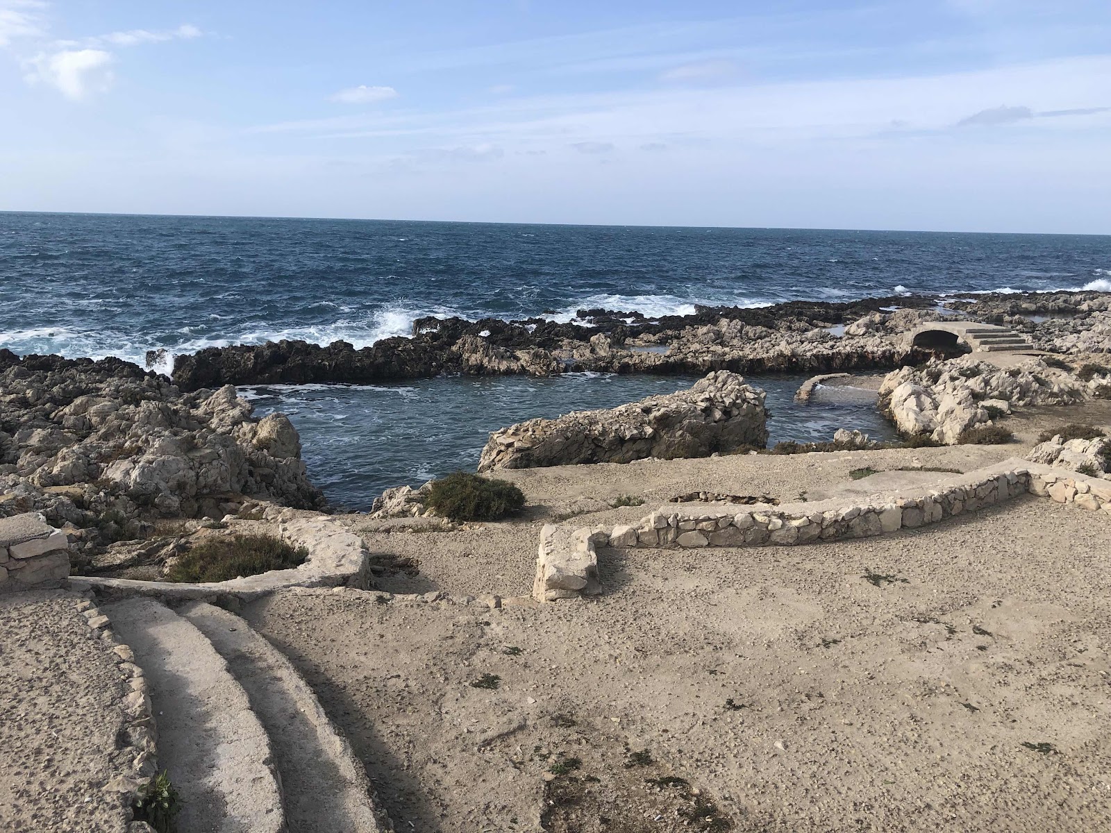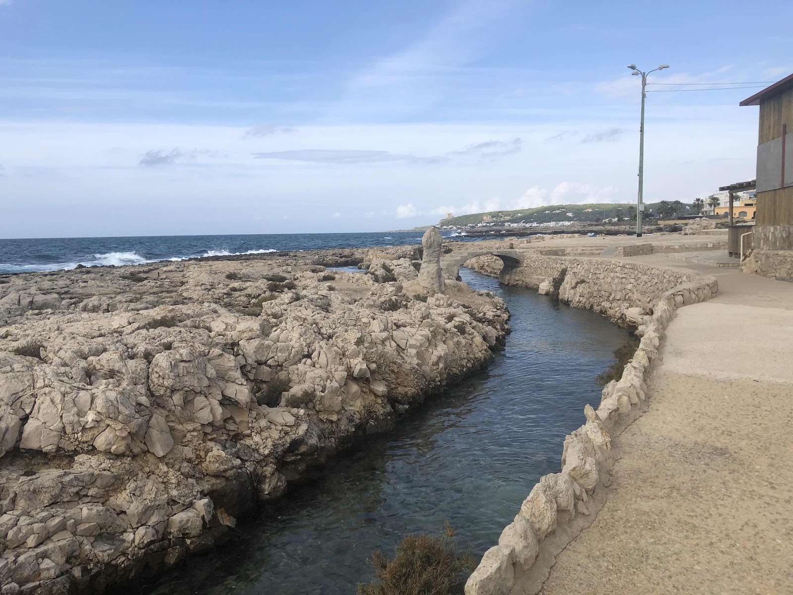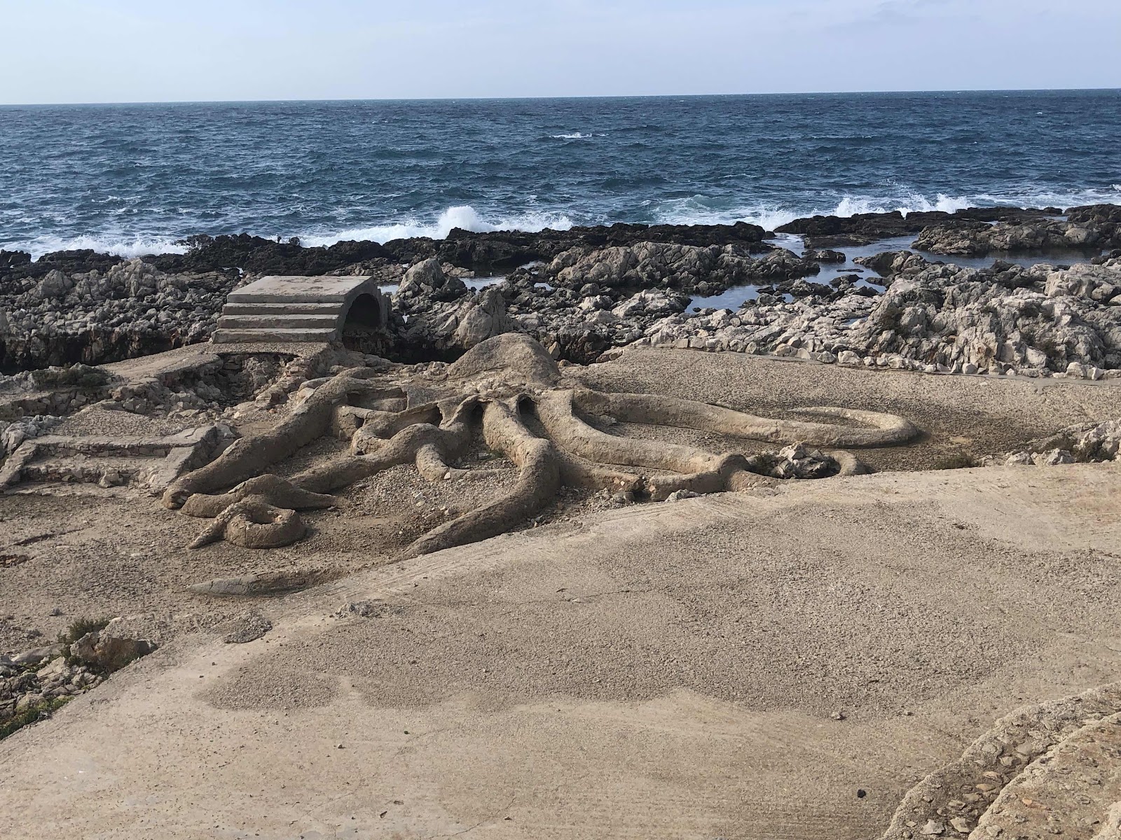 Den Namenszusatz „di Bagno“ hat Santa Maria wohl erst später bekommen. Die Küste ist felsig, nicht unbedingt eine gute Gegebenheit für einen Badeort. Aber man hat clever und wie wir finden sehr schön eine Lösung dafür gefunden: in das Felsplateau sind künstlich Becken geschlagen worden, die von der Brandung des Meeres mit Wasser gefüllt werden. Untereinander sind mehrere Becken mit ebenfalls durch Menschenhand entstandene Kanäle verbunden. Dazwischen stehen Skulpturen verschiedener Meeresbewohner, leider sind sie am verwittern, aber trotzdem nett gemacht.