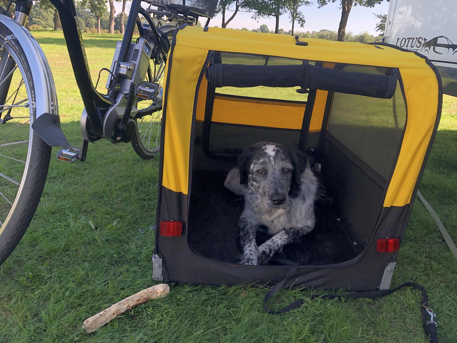 Wir nutzen die Gelegenheit und gewöhnen Benny wieder an seinen Fahrradanhänger, lange haben wir das nicht gemacht, also sind wir sehr behutsam: erst ohne Räder, dann mit, erst schieben, dann Ministrecken radeln - und natürlich gaaaanz viele Leckerlies! Nach drei Tagen wagen wir eine längere Strecke.