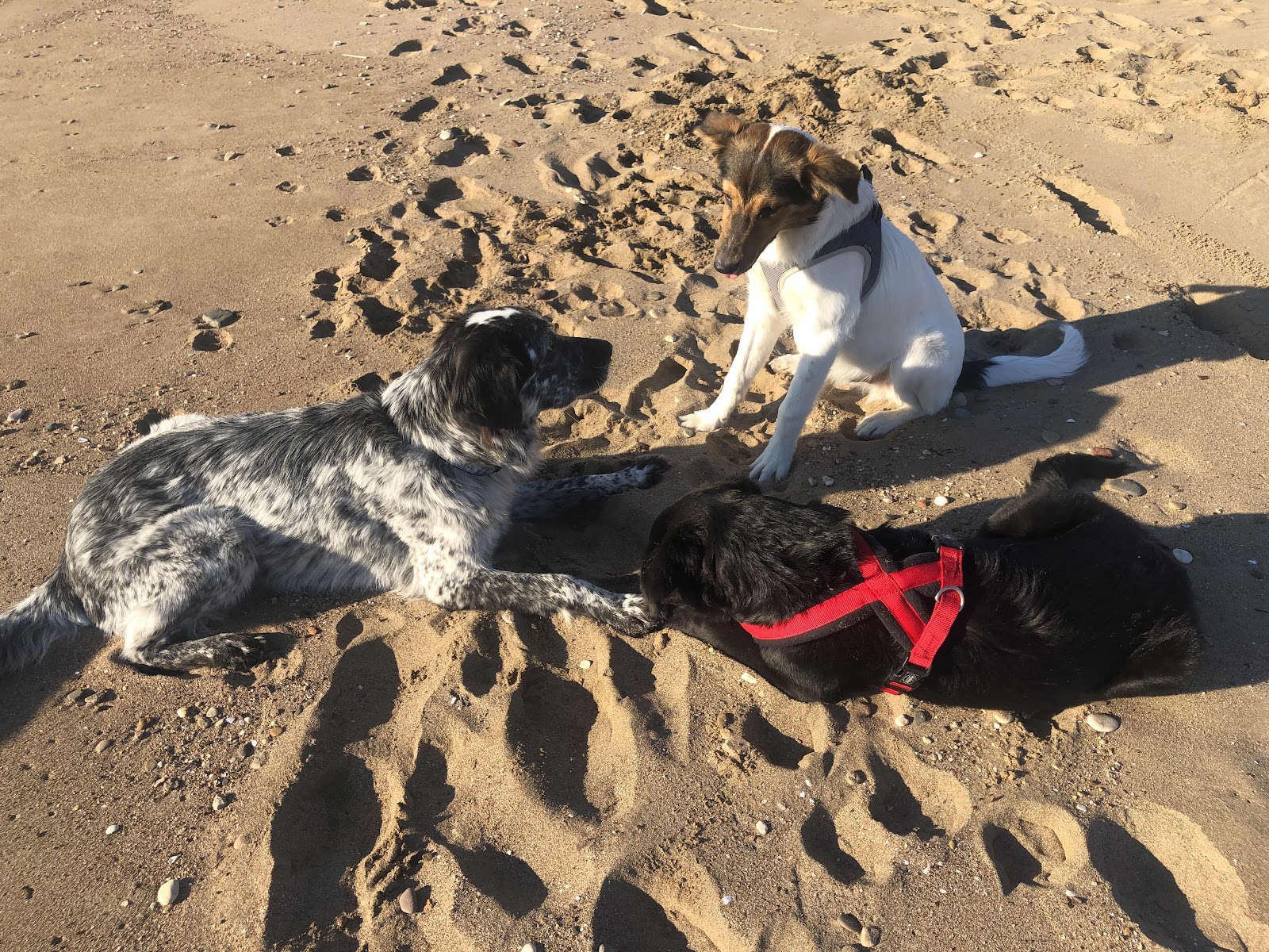 Unsere Hunde haben täglich ihren Spaß am Strand und im Sand - und sehen anschließend immer aus wie panierte Schnitzel, sind aber dann auch angenehm müde.